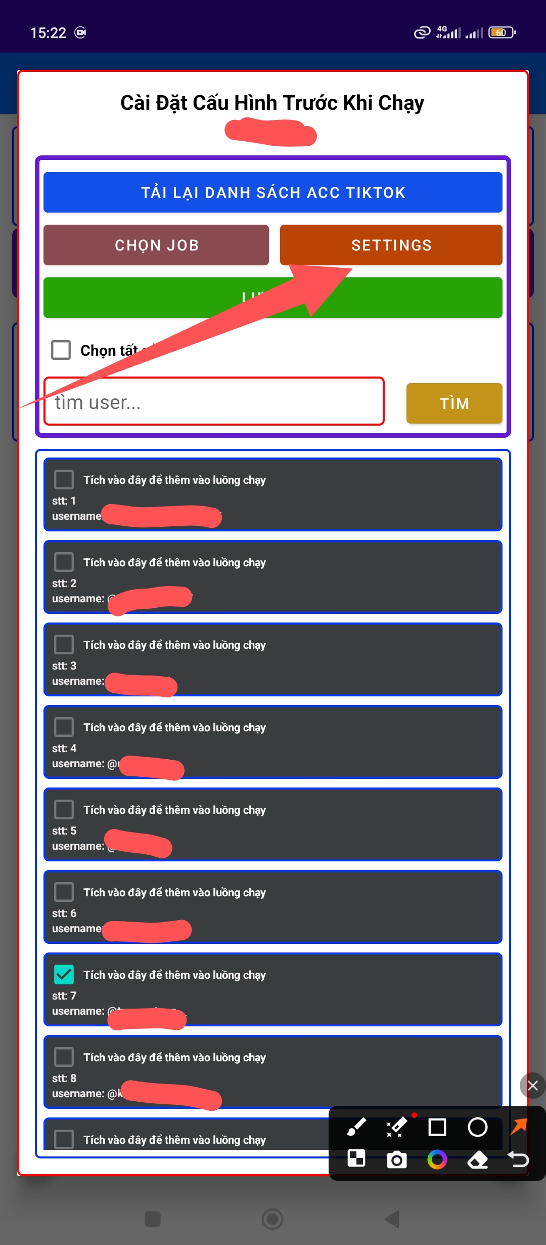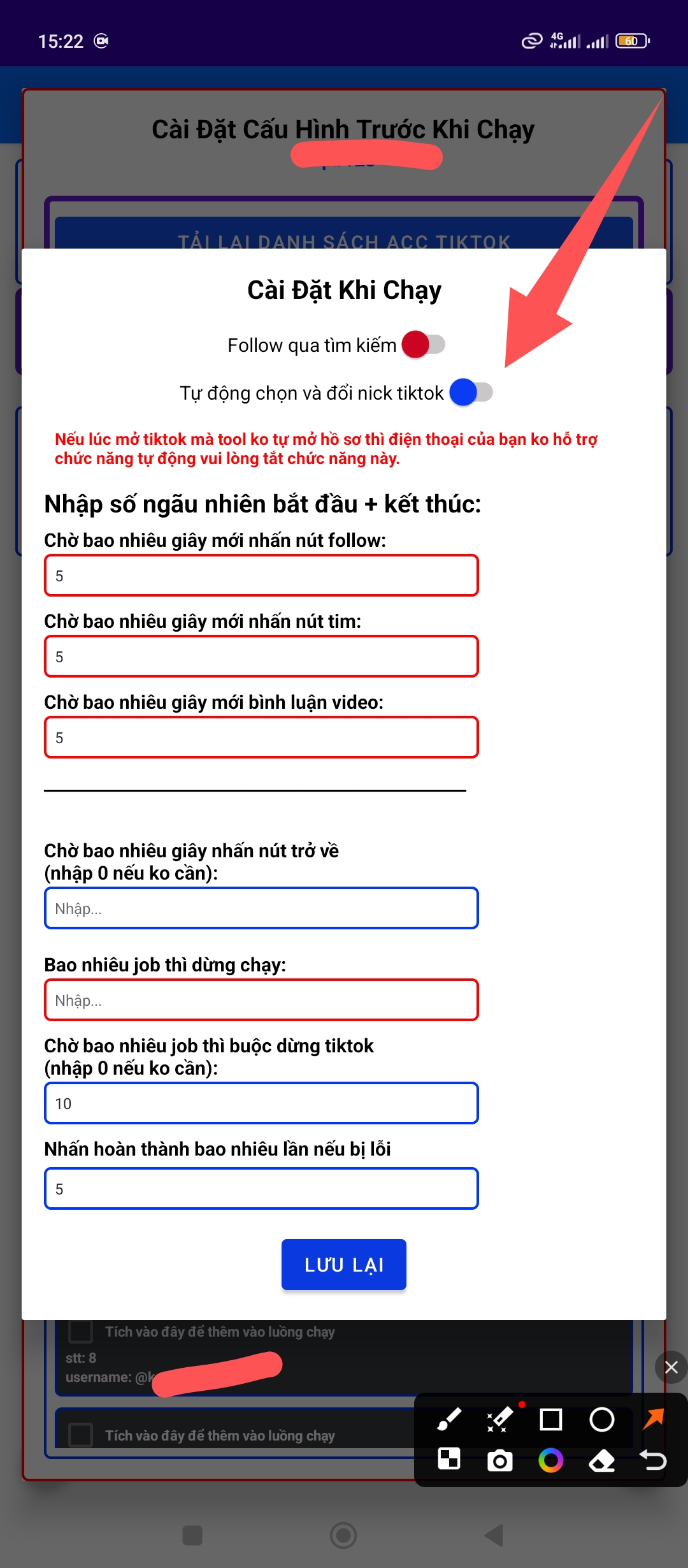 Buớc cuối cùng các bạn bật nút tự động chọn và đổi nick tiktok như hình bên dưới