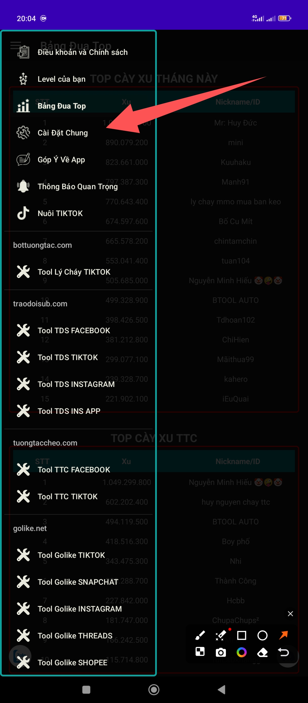 Bước đầu tiên các bạn vào giao diện của tool muốn chạy và chọn nút cài đặt như hình bên dưới