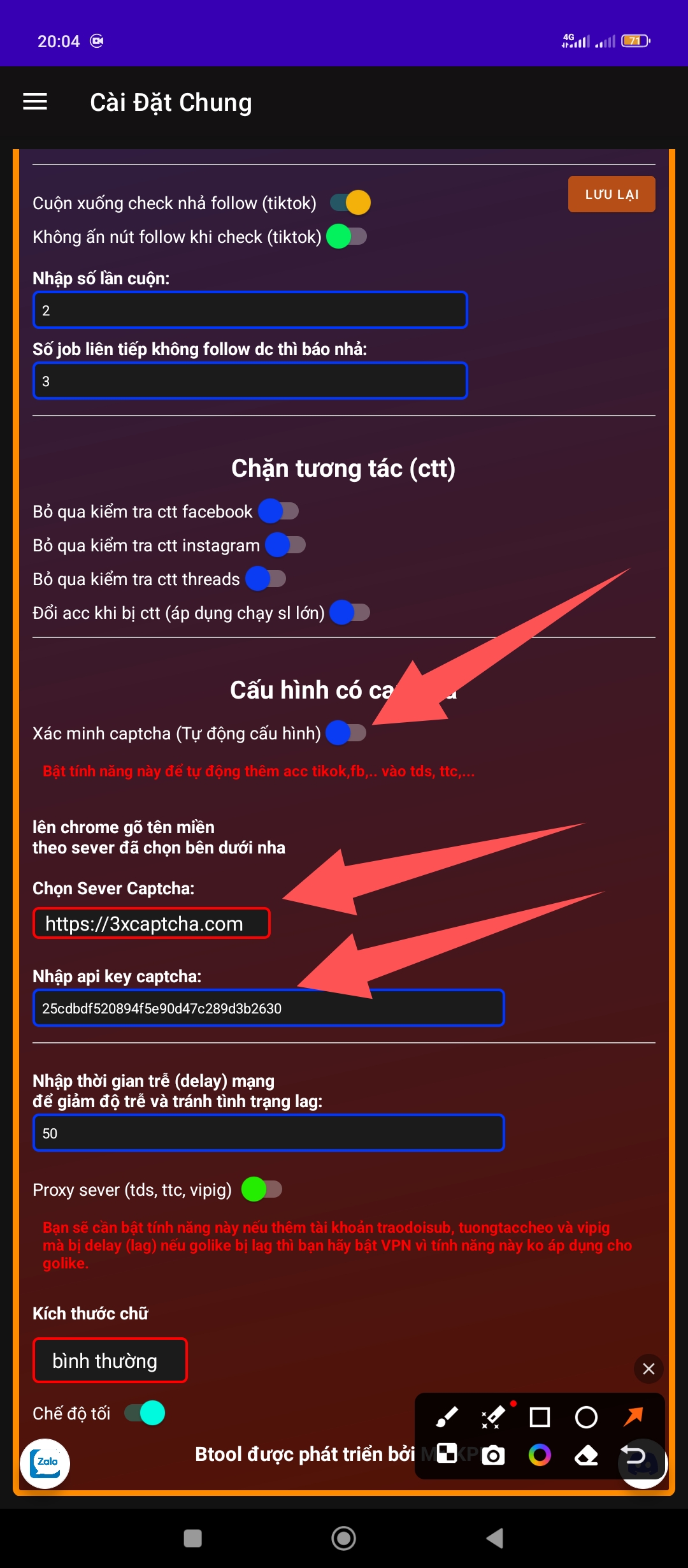 chọn sever captcha và gõ tên miền captcha tương ứng trên trình duyệt sau đó nạp tiền và lấy apikey captcha và dán vào tool là xong (nhớ ấn nút lưu lại).