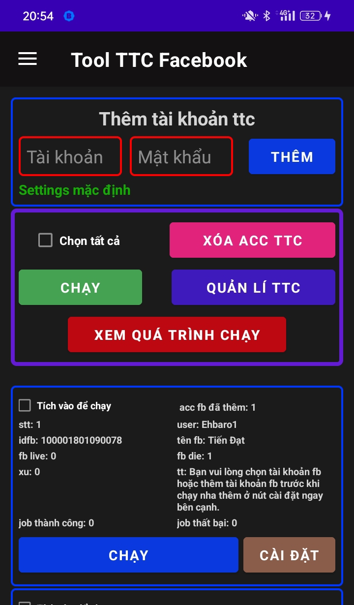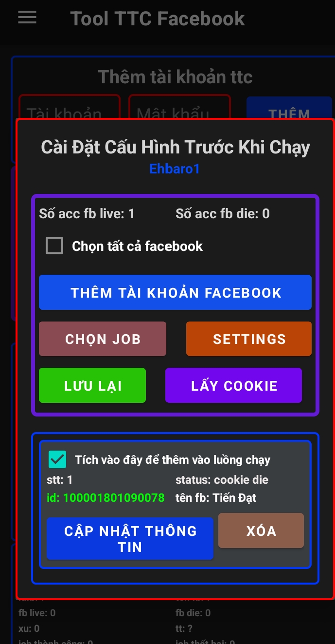 Nếu Vẫn ko đc thì vô phần cài đặt bên cạnh chữ chạy xem đằng sau chữ id: hiện màu gì(đỏ là ACC die,xanh là ACC sống) và xem sau chữ status: cookie die thì lấy lại cookie thay vào và bắt đầu chạy lại